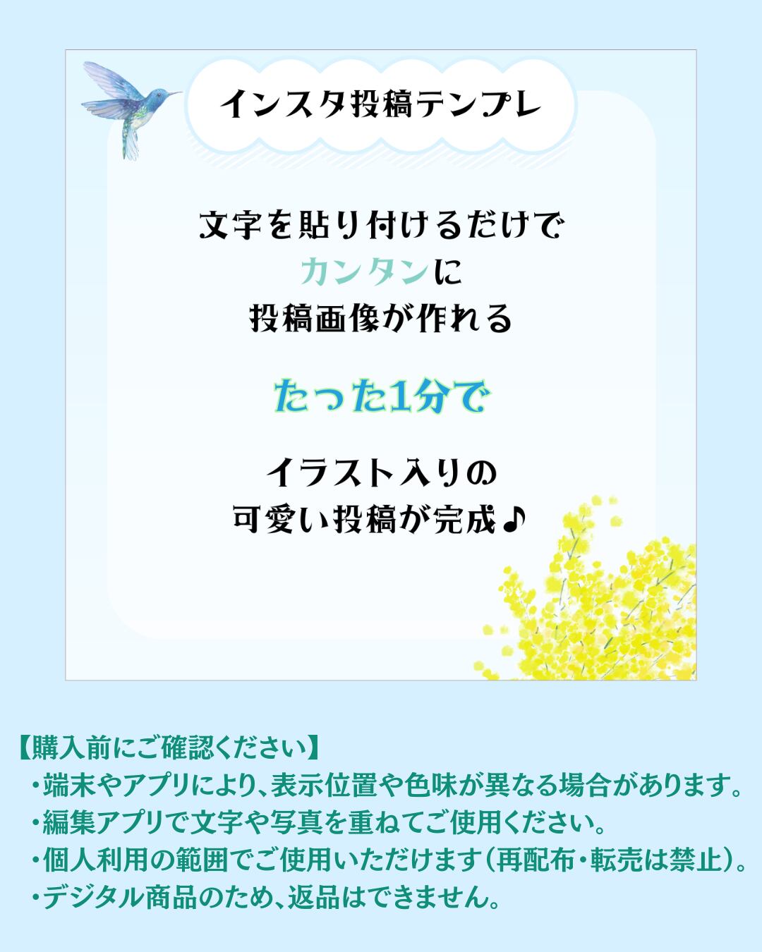 やわらかな空色の背景に、ふわっと広がるミモザの粒感。投稿にのせた言葉を引き立てながら、前向きで軽やかな印象に整えてくれます。