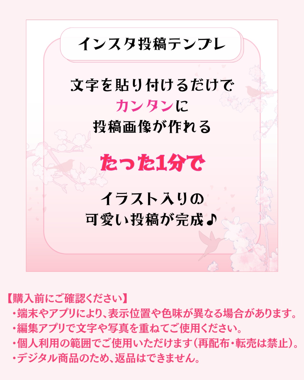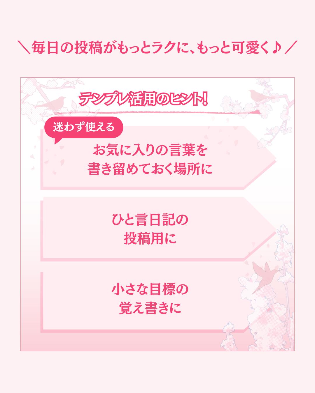 毎日の投稿を、もっと気軽に、もっとかわいく。文字をのせるだけで使えるテンプレートだから、忙しい日でも“世界観のそろった投稿”を続けやすくなります。