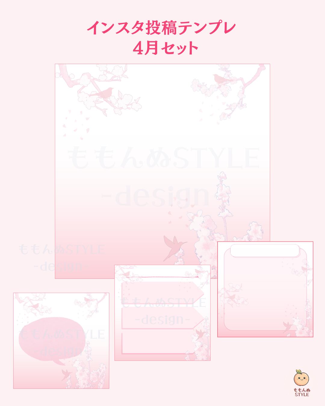 「ももんぬSTYLE -design-」オリジナルの優しい色合いのイラストを使った、Instagram投稿向けテンプレート。 スマホ壁紙と連動した2026年版 4月のイラストデザイン(桜ピンク)の6枚セットです。